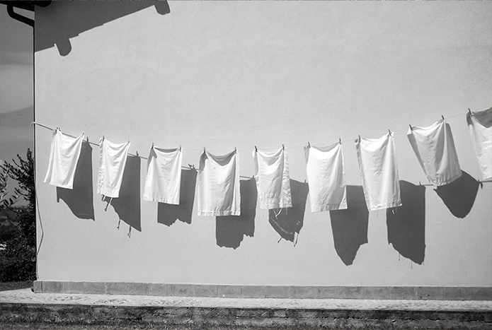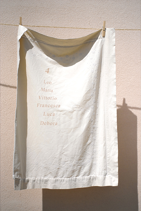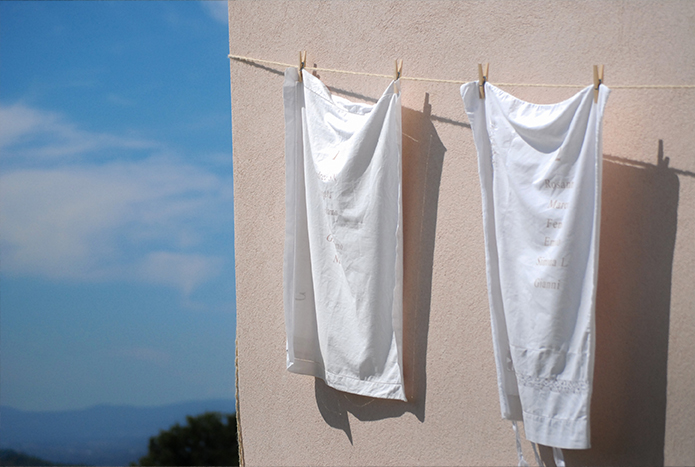 seconda parte: per accentuare il tema della casa di Famiglia, l’idea del tableau de mariage stampato sulle federe vintage e appese al sole davanti casa.