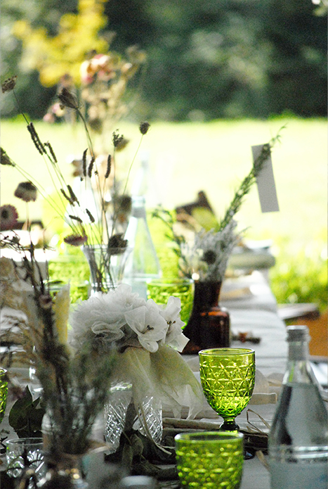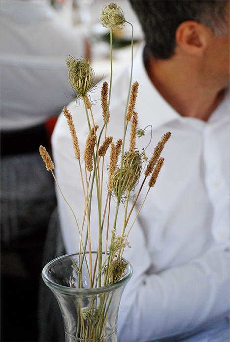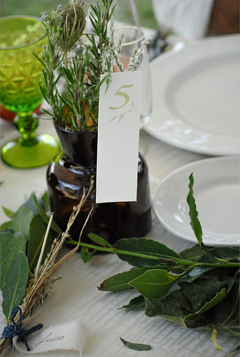 I numeri -tavolo sono appoggiati al rosmarino , che insieme a fiori campestri decorano” distratti” la tavolata, con un effetto di semplice naturalezza.