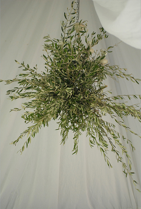 bottiglie da vino da osteria e vasi vintage sono usati come centrotavola. Sotto il tendone drappeggiato di garza , i lampadari sono ricoperti di ulivo .