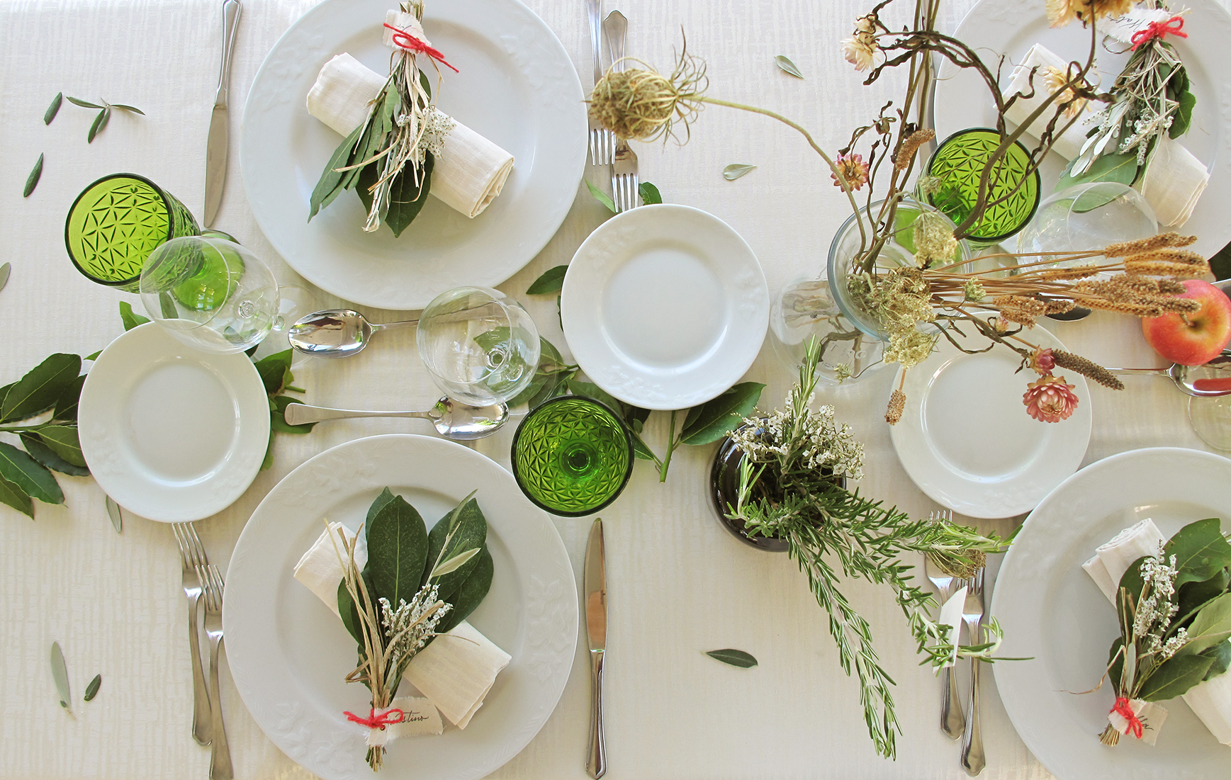 La tavolata doveva sembrare come se” il pranzo fosse già in corso” con foglioline di ulivo, di fico e di alloro qua e là insieme a qualche mela rossa. Segnaposto scritti a mano su un tessuto e legati ad un mini bouquet nel piatto.